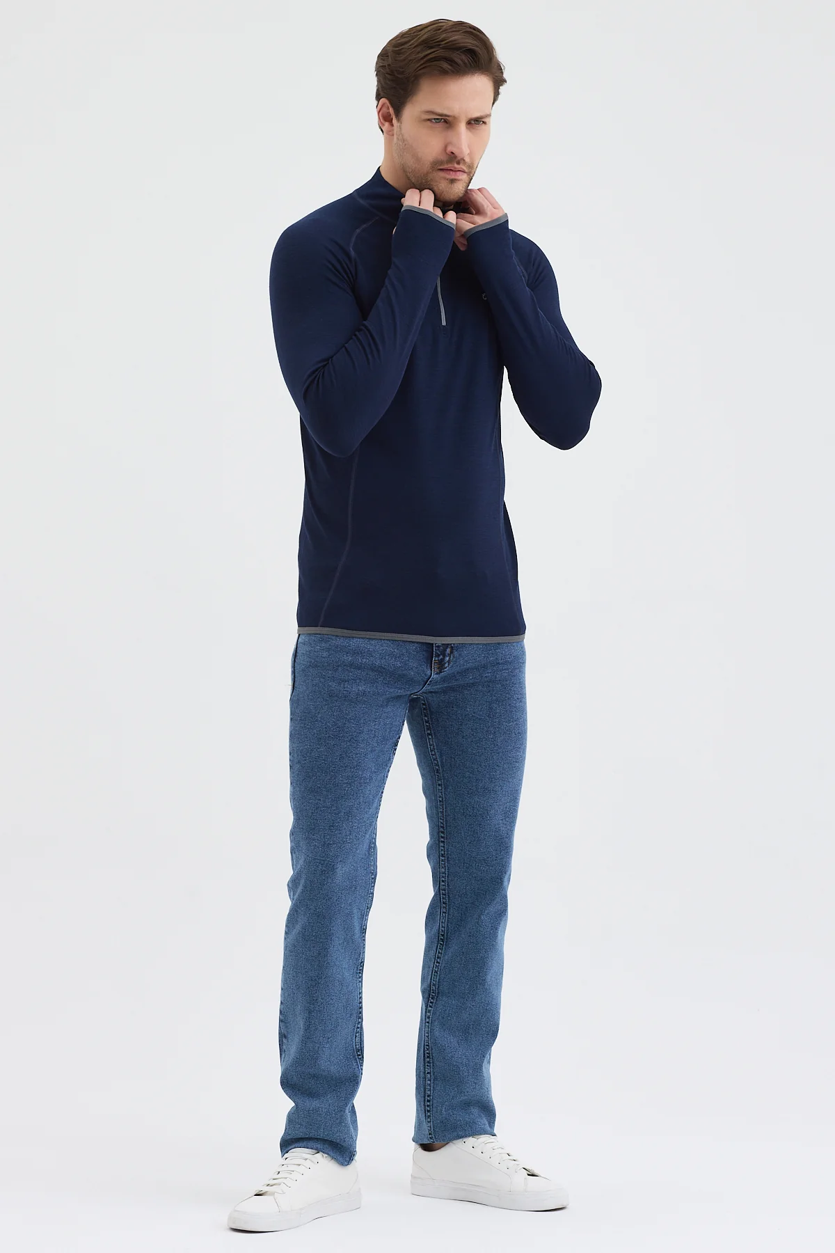 Ένα εντυπωσιακό φερμουάρ που φτάνει μέχρι το μισό στήθος (μισό φερμουάρ) επιτρέπει εύκολο ντύσιμο και επιπλέον έλεγχο αερισμού κατά τη διάρκεια σωματικών δραστηριοτήτων. Τα μανίκια έχουν ανοίγματα για τους αντίχειρες , τα οποία προστατεύουν τα χέρια από το κρύο και εμποδίζουν την ανύψωση των μανικιών κατά την κίνηση, μια πρακτική λύση για ορειβάτες , δρομείς και όλους τους λάτρεις των χειμερινών σπορ .